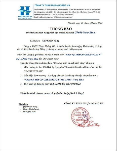 Nhân dịp ra mắt sản phẩm mới 𝐆𝐏𝟎𝟎𝟏- 𝐍𝐀𝐕𝐘 𝐁𝐋𝐔𝐄 công ty TNHH Nhựa Hoàng Hà trân trọng gửi lời cảm ơn Quý khách hàng đã luôn đồng hành, hợp tác và cùng hướng tới sự phát triển.
